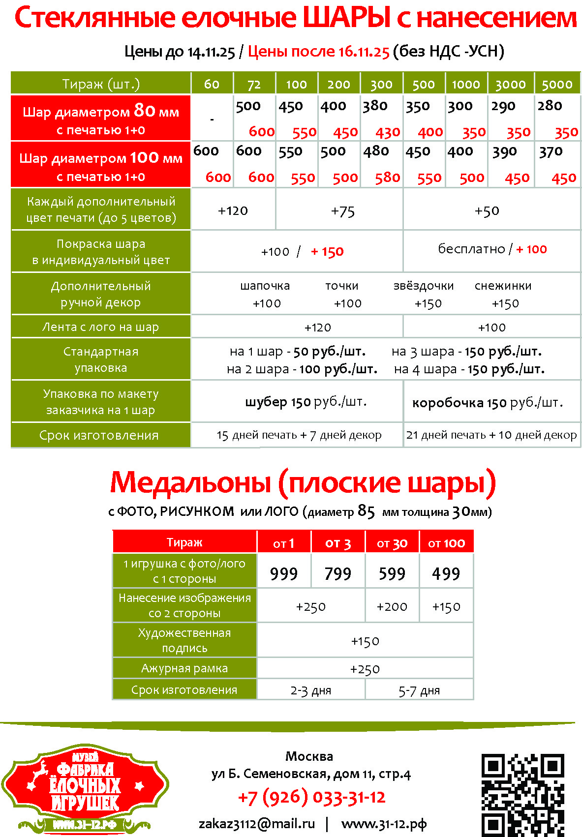 Прайс 2025 года на производство стеклянных ёлочных шаров с нанесением изображения (логотипы, фото, картинки рисунки, поздравления) (цены в рублях без НДС / не является публичной офертой)